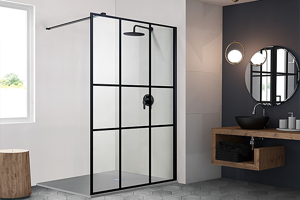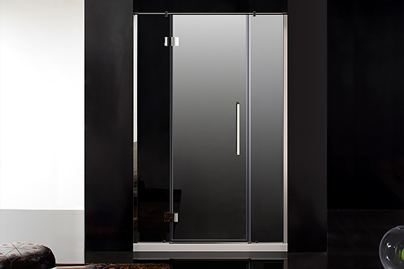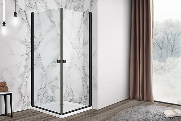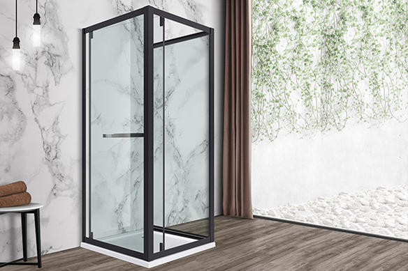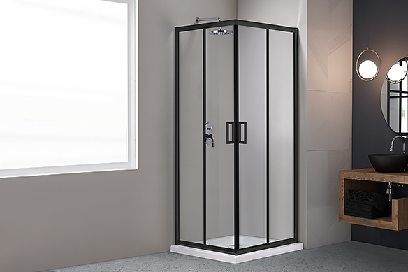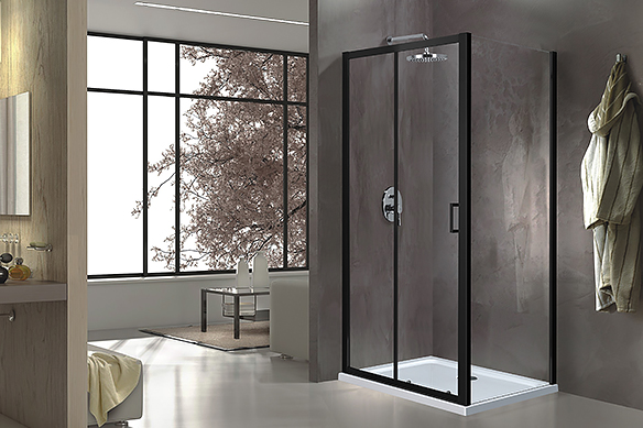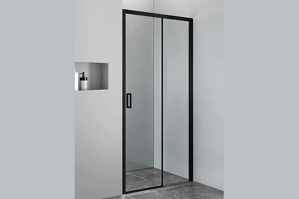 Shower enclosure withblack flat aluminum frame.Concise design with no bottom rail.Available as sliding models f