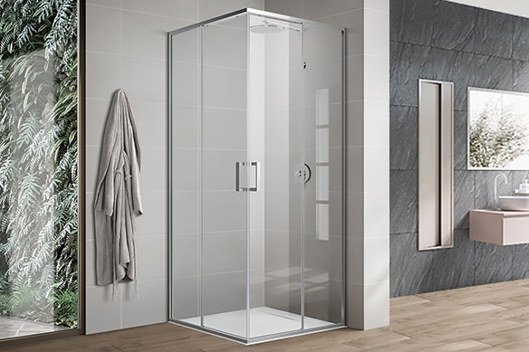 Aneo-angle shower enclosure features a corner design and a modern shape that is the perfect complement to an