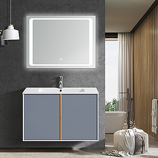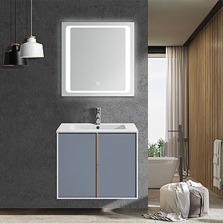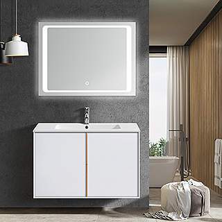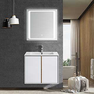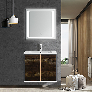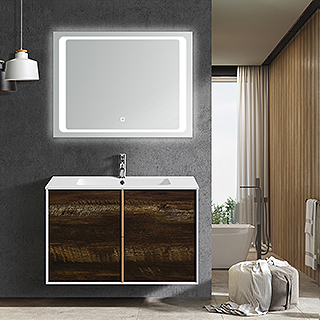 The DF series is a wall-mounted bathroom cabinet with a sleek white ceramic washbasin and unit base. It features ample storage space, solid wood handles and a choice of finishes. Simple and modern, this piece features an elegant touch switch and a mirror that surrounds the led lights.