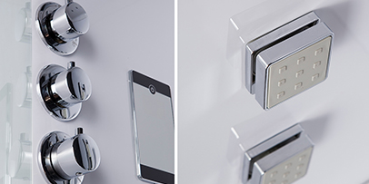 "White Space" gives a good idea of a pleasant personal Spa, with its dorsal massage jets and steam dispenser for saunas, where you can enjoy moments of complete relaxation and renewed vitality.The white of the 98 series  blends with the harmonious and minimal forms of the structures, to leave full space for the diffusion of colored lights, activated by LEDs.